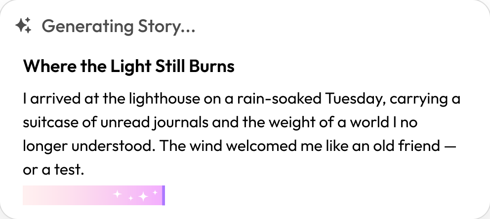 Personalize your story by adjusting the plot, genre, narrative perspective, key characters, character names, and story length directly in the prompt. Choose between the GPT-5 model and DeepSeek R1 for distinct results, or regenerate the story if you're not satisfied. It’s guaranteed to create the story you’re looking for.